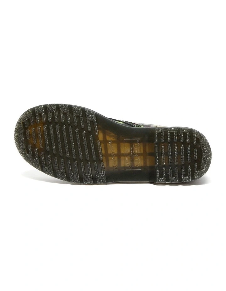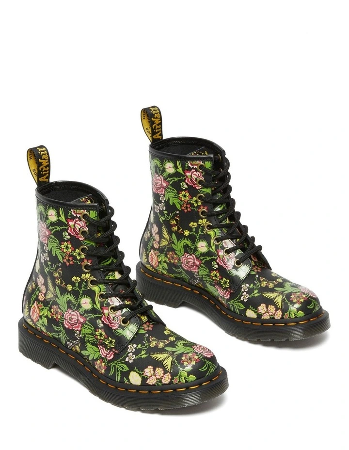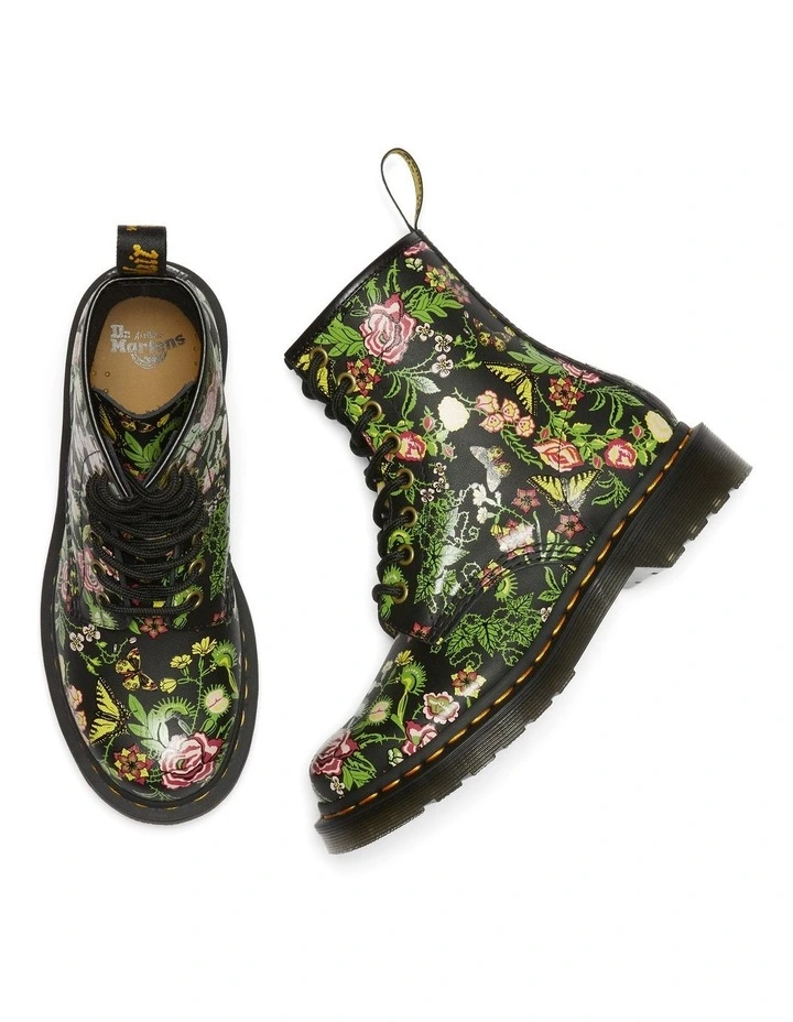 Bloom pack. Taking cues from decades of floral Docs boots, our new designs have butterflies and Venus fly trap flowers for a subversive edge. The 1460 8-eye boot, are printed all over with a dark floral Bloom print on durable Backhand leather. All set on a smoke DMS sole and