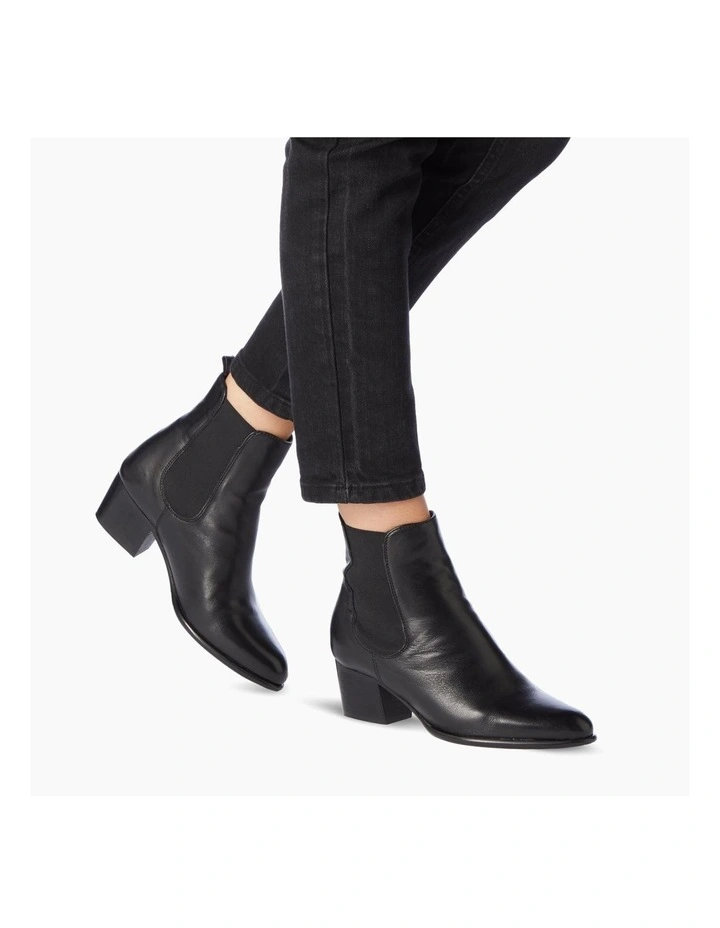 The Patterson boot from Dune is a great option for your off-duty wardrobe. It includes a low block heel a rear tab and a classic almond toe. Finished with the signature elasticated side panel.