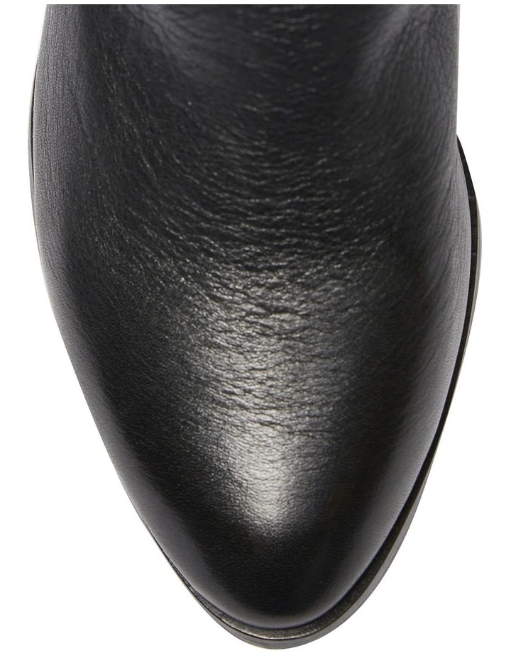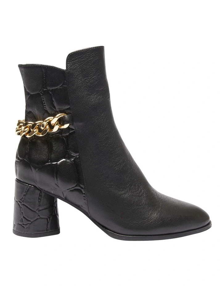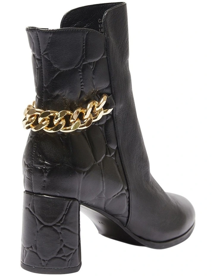 CABARET is a stylish rendition of the classic boot silhouette with playful proportions. They’re crafted with a leather upper to a pointed toe then feature a textured back panel embellished with a polished gold coloured chain. Show off the detailing by pairing this with a-line wool skirts and cuffed denim jeans.Β