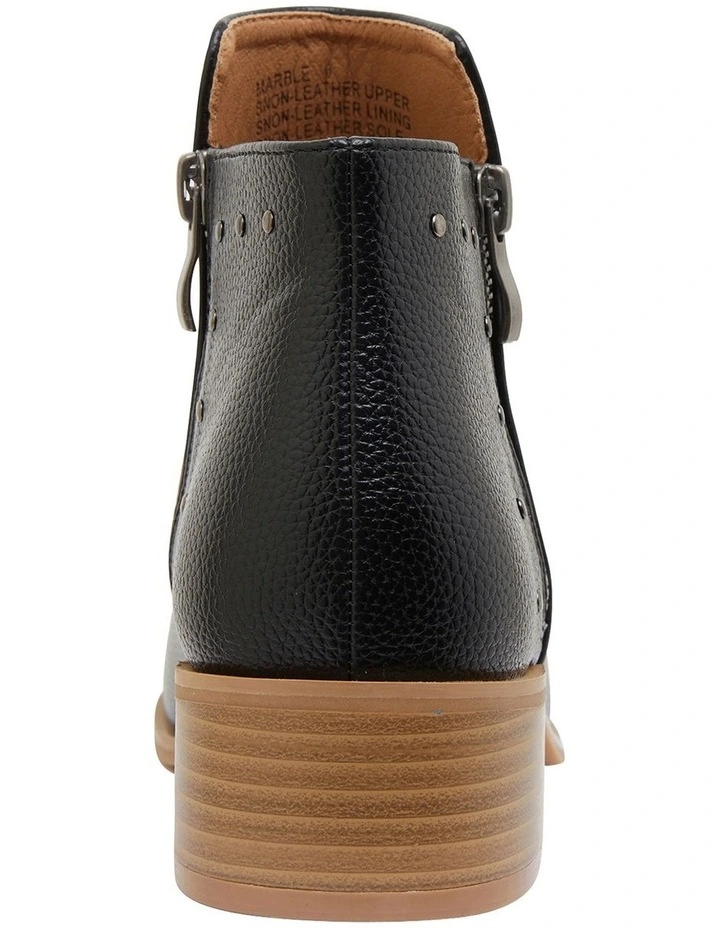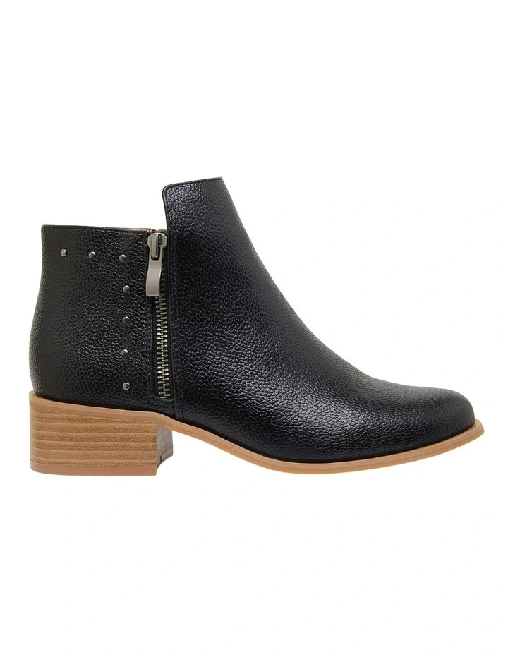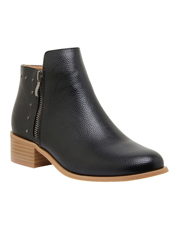Resting on a flat stacked heel for a trendy look. It features a refreshing simple twin zip ankle boot accented with a studded detail.Β