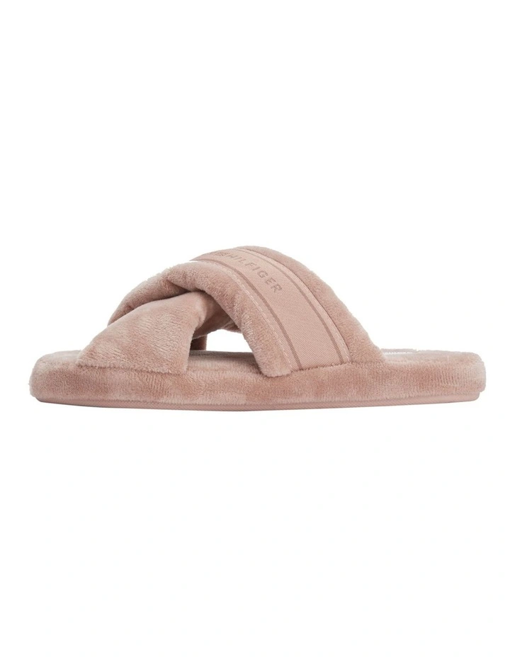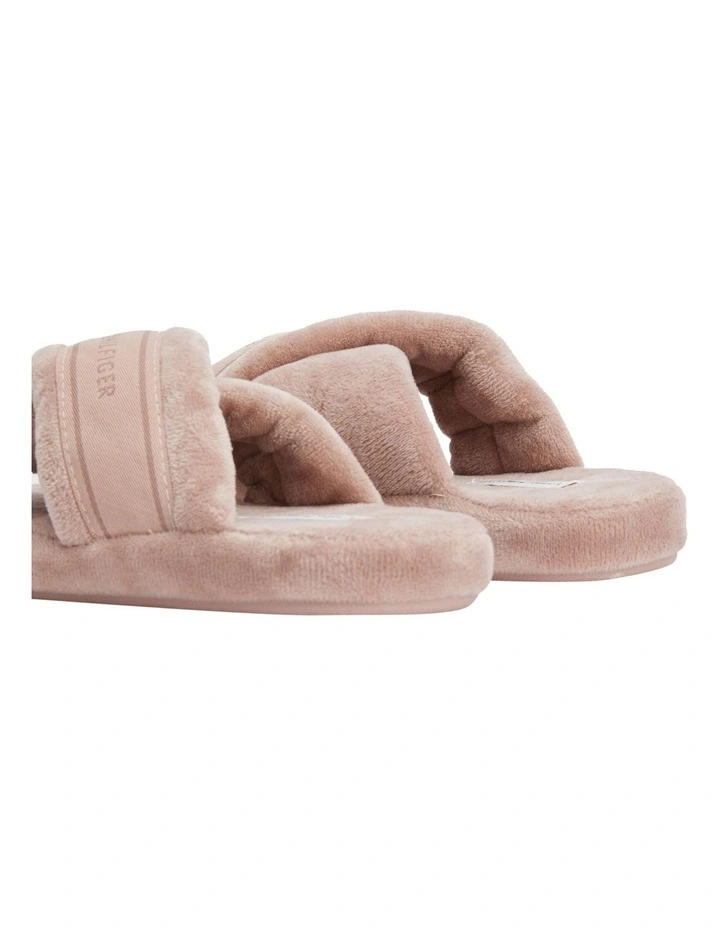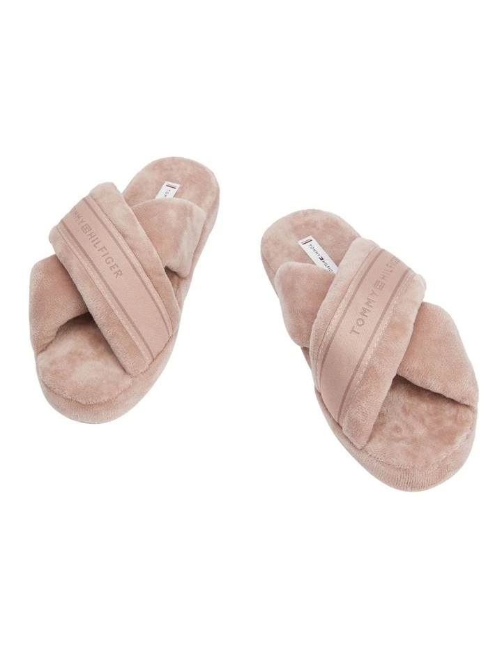 Luxe lounging beckons with these soft slippers featuring an elegant crossover strap for a touch of cosy chic.