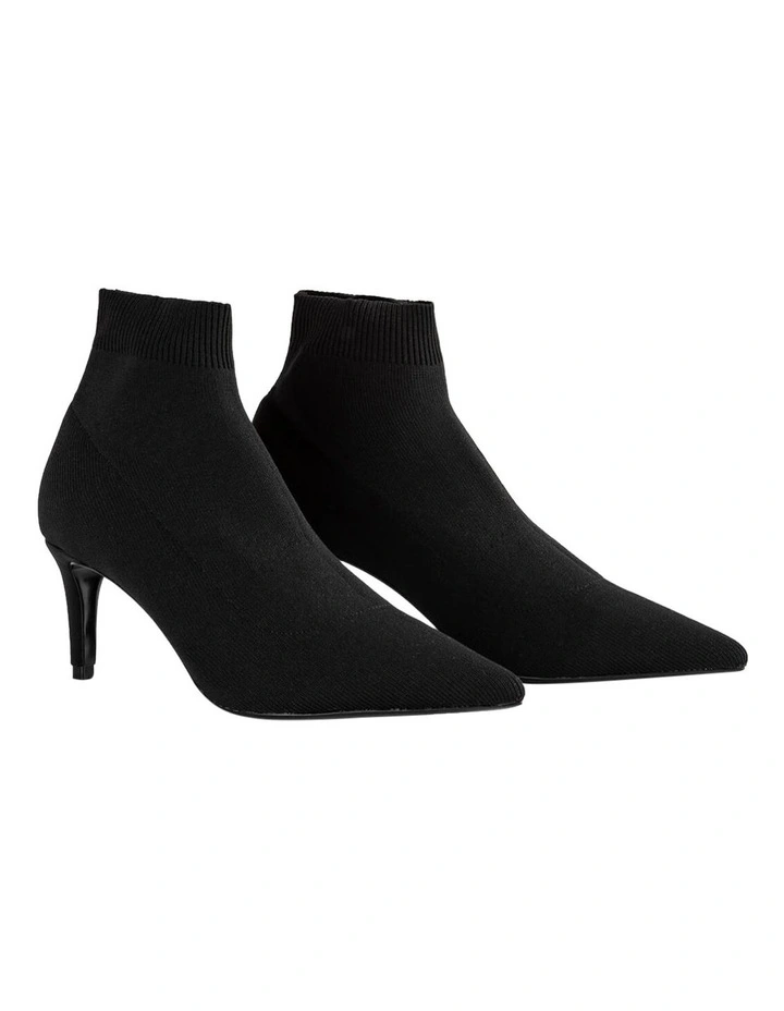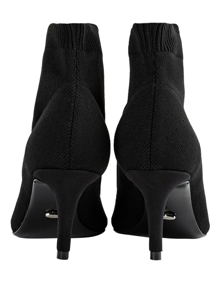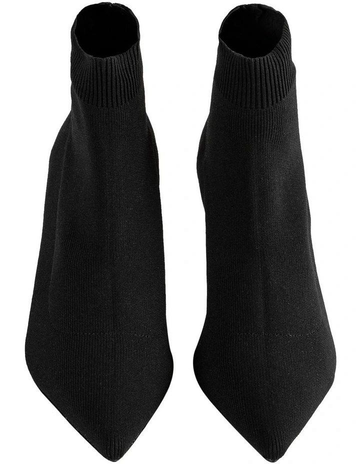 A black sock ankle boot with a pointed toe shape, stiletto heel and textured knitted fabrication.