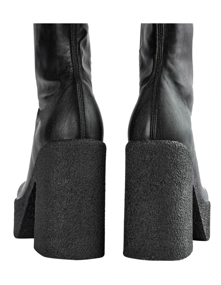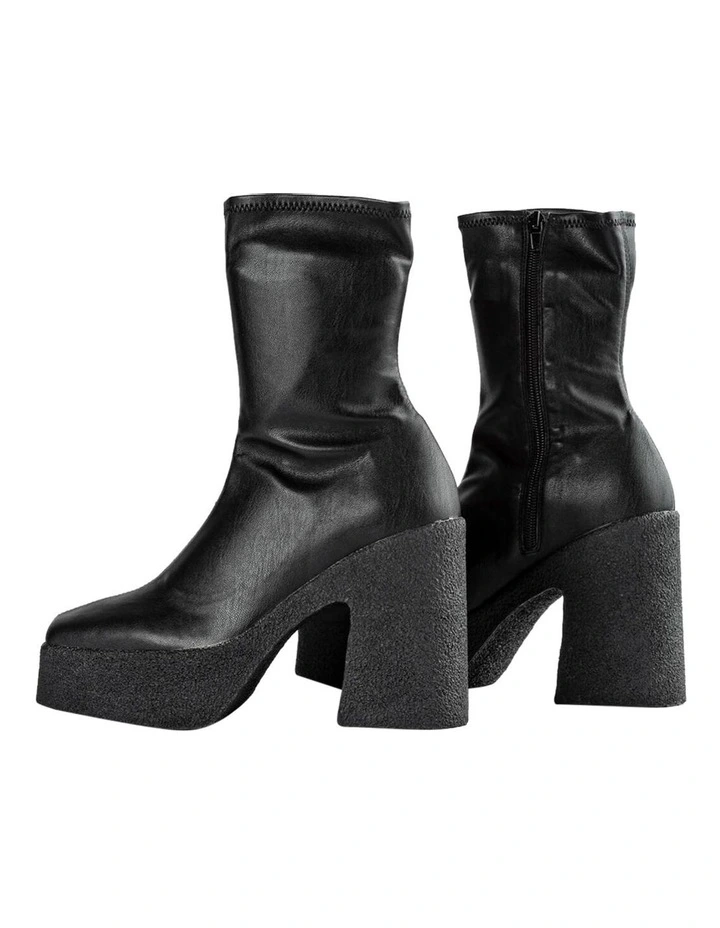 Elevate your style with the Jude boot in black venezia today. Designed with a sock-like fit, the Jude features a leather-look exterior with an exposed black side zip to the inner ankle and is set upon a platformed chunky sole with an 11.5cm heel.