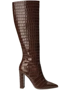 Get ready to fall in love with the subtle slouch of the Lucille boots. Crafted with a genuine brown croc printed leather this stylish knee-high boot features a pointed toe and pairs perfectly with midi dresses or skirts.